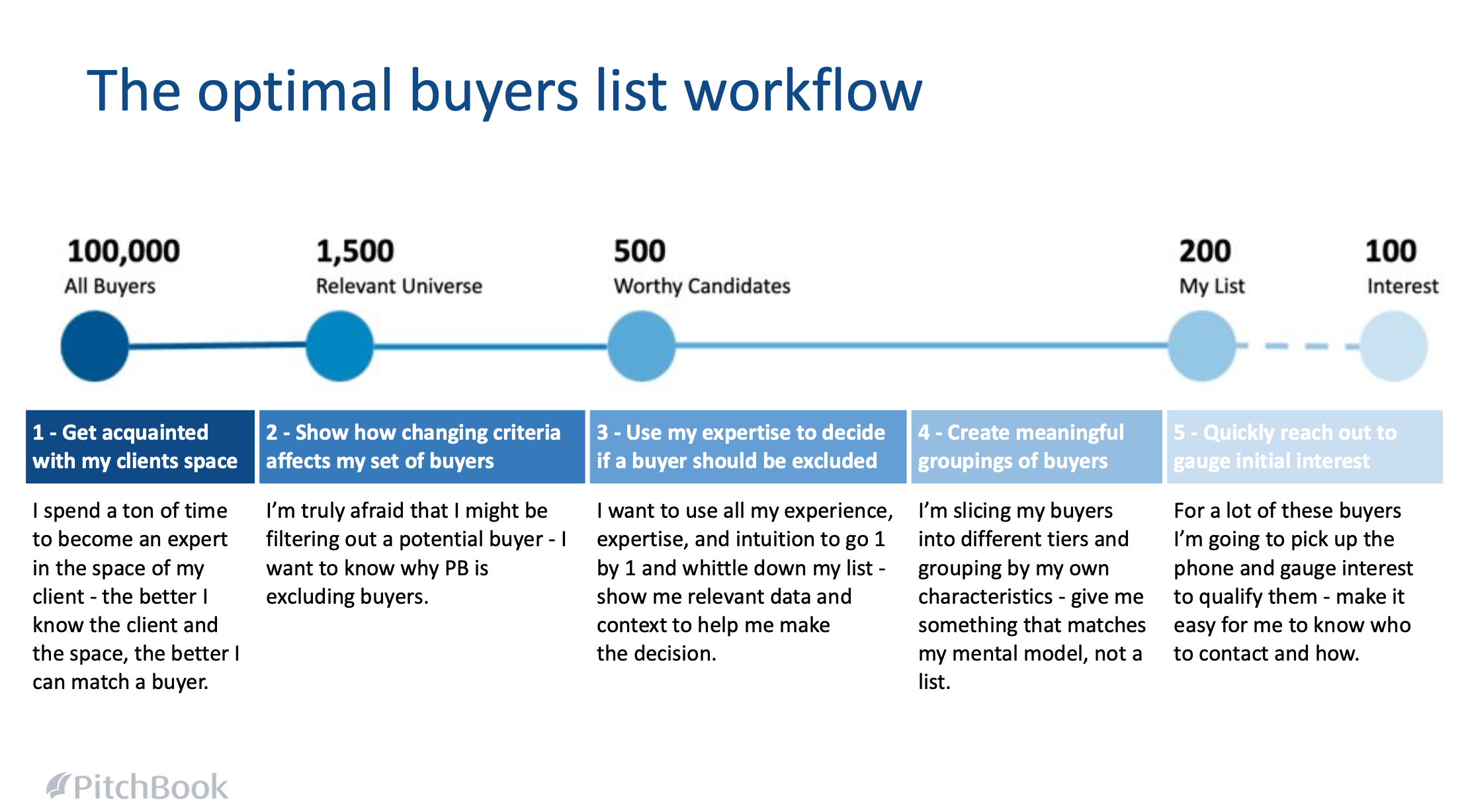“A guided workspace that helps you cast a wider net, avoid blind spots, and build a stronger, more defensible buyers list—without leaving PitchBook.”